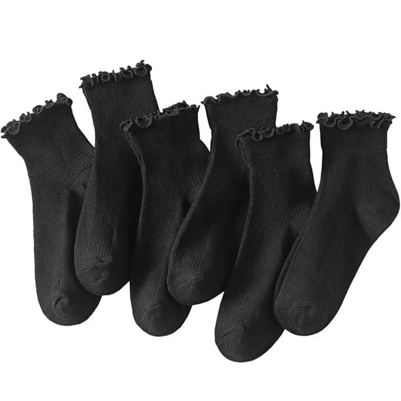 Meet Cherokee of California's Ruffle Turn-Cuff Casual Socks. Made from a blend of 78% cotton, 16% polyester, and 6% spandex, these ankle-high socks feature a stylish ruffle turn-cuff design with a frilly trim, adding a special touch and a youthful, charming vibe.