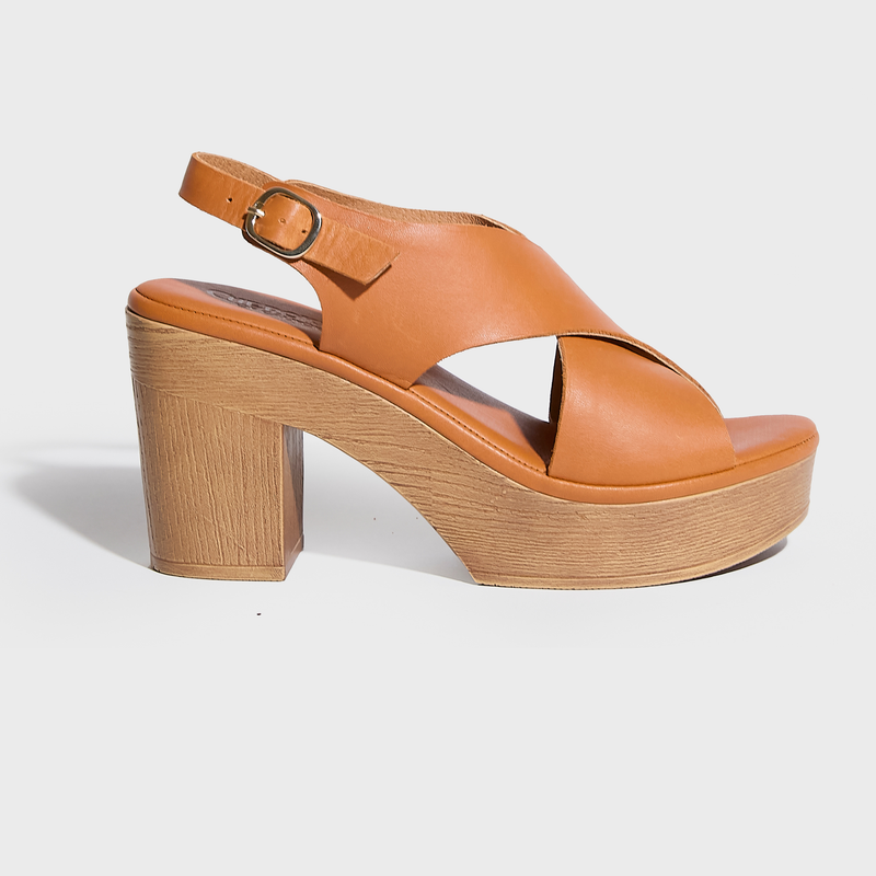 Meet the BONNIE RAITT, a sophisticated platform sandal crafted from creamy peanut-toned leather. Set on our classic Dalia wood bottom, it blends natural elegance with modern edge. The smooth leather upper molds beautifully to your foot, while the sturdy wood platform provides effortless lift and support. Finished with our signature California Construction comfort footbed, the Bonnie Raitt Peanut is the perfect balance of vintage charm and everyday sophistication.
