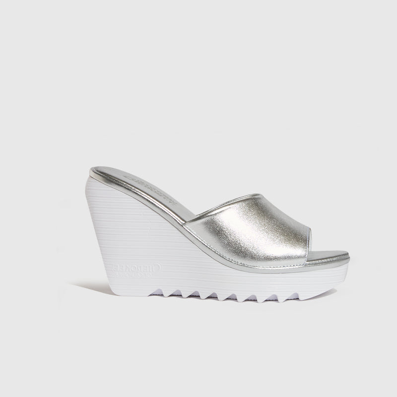 Hello CINDY! The original 4-inch "High Beep" lightweight flexible wedge. Handcrafted from soft, metallic silver full grain leather with a white bottom, effortlessly conforming to your foot. It pairs with our original California Construction padded footbed, offering luxurious comfort and style.