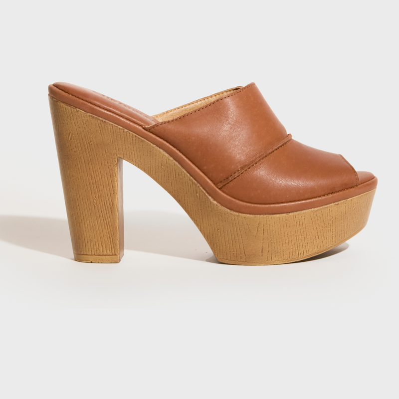 Meet the JOPLIN, a bold platform mule that exudes effortless 70s glamour. Crafted in supple café-toned leather, it features a sleek open-toe design that slips on with ease. Set on our Eboni wood bottom, the high block heel and platform offer confident height with lightweight stability. Finished with our signature California Construction padded footbed, the Joplin delivers standout style and all-day comfort in one striking silhouette.