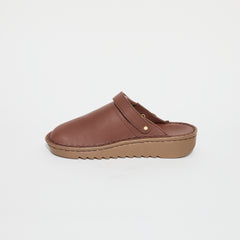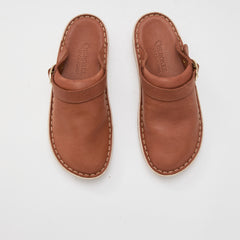 Introducing the Malibu, a modern clog with effortless ease and earthy sophistication. Crafted in rich cacao-hued leather, this slip-on style features a clean, minimalist upper accented by a delicate adjustable strap with a golden buckle. Set on our signature Zeeta brown bottom, the lightweight platform offers subtle lift with soft cushioning underfoot. Finished with California Construction and a padded footbed, the Malibu delivers all-day comfort and laid-back polish for everything from morning errands to sunset strolls.