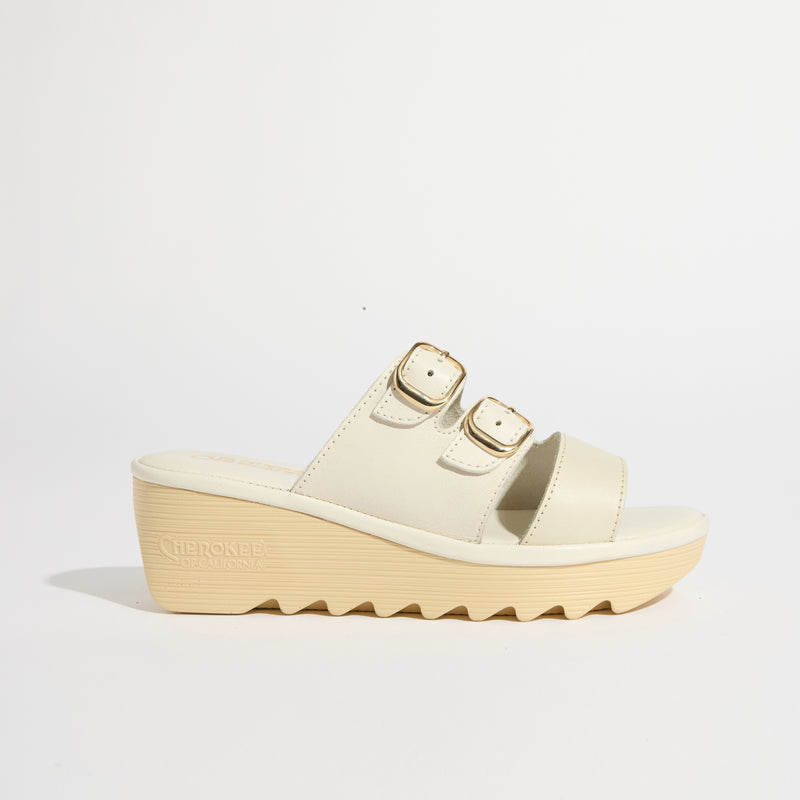 Meet CHARLOTTE, a modern twist on the two-buckle slide sandal on our classic 2-inch "Mid Beep" lightweight flexible wedge. Its soft, off-white full-grain leather upper features adjustable straps and high-quality silver buckles. It pairs with our original California Construction padded footbed, offering luxurious comfort and style.